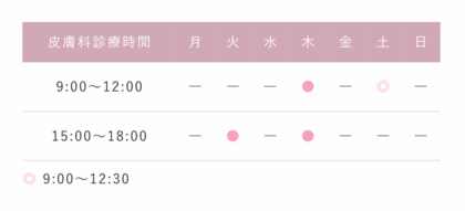 1/17土曜から水曜午前と土曜午前の皮膚科の診療時間が9:00-12:30に変更となります。